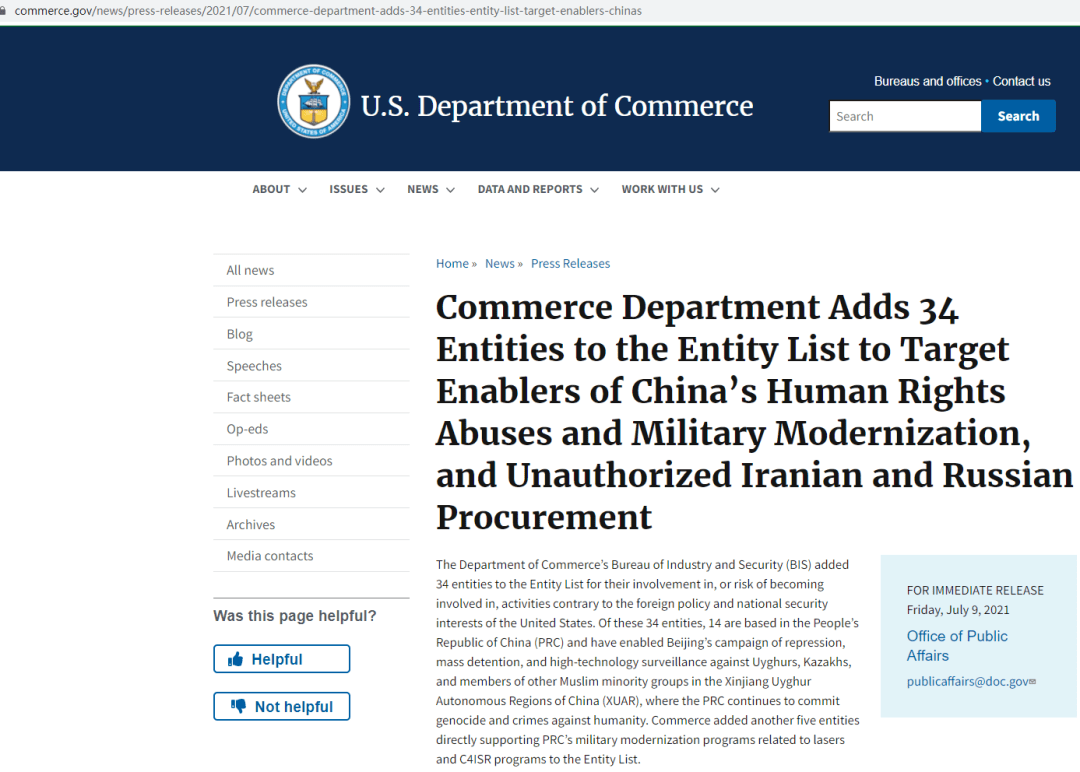 就在這個(gè)月的7月12日,美國(guó)商務(wù)部產(chǎn)業(yè)與安全局(BIS)通過(guò)《聯(lián)邦政府公報(bào)》(Federal Register)發(fā)布了一項(xiàng)最終規(guī)則(final rule),來(lái)自中國(guó)的24個(gè)實(shí)體/個(gè)人從事或促成了有違美國(guó)國(guó)家安全或外交政策利益的活動(dòng),因而將其列入“實(shí)體清單”。被列入清單的理由、列入后的許可要求和許可審查政策如下。