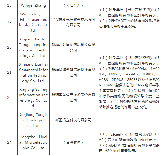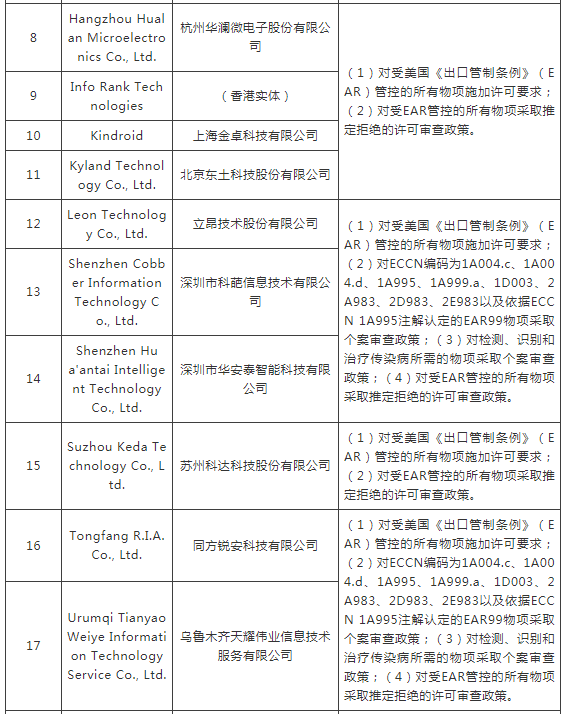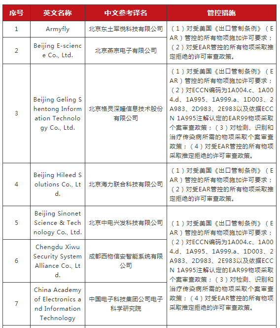 ERC認(rèn)定以下實(shí)體與所謂“中國(guó)在新疆的侵犯人權(quán)行動(dòng)”有牽連,違反美國(guó)外交政策,將其列入“實(shí)體清單”。
