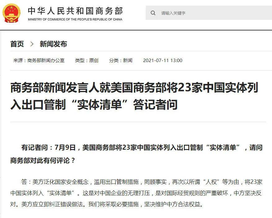 7月9日,商務(wù)部新聞發(fā)言人就美國(guó)商務(wù)部將23家中國(guó)實(shí)體列入出口管制“實(shí)體清單”答記者問:美方泛化國(guó)家安全概念,濫用出口管制措施,罔顧事實(shí),再次以所謂“人權(quán)”等為由,將23家中國(guó)實(shí)體列入“實(shí)體清單”。這是對(duì)中國(guó)企業(yè)的無(wú)理打壓,是對(duì)國(guó)際經(jīng)貿(mào)規(guī)則的嚴(yán)重破壞,中方堅(jiān)決反對(duì)。美方應(yīng)立即糾正錯(cuò)誤做法。我們將采取必要措施,堅(jiān)決維護(hù)中方合法權(quán)益。