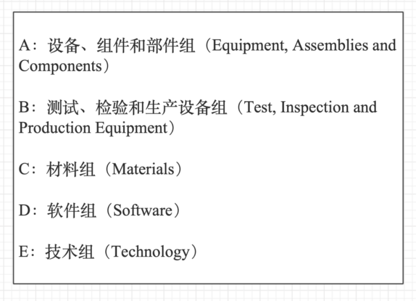 第二位:字母, 標(biāo)記A為設(shè)備、組件、零件, B為檢測(cè)設(shè)備,C為材料,D為軟件,E為技術(shù);