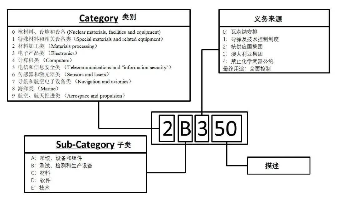 歐盟出口管制物項(xiàng)ECCN的第一、第二位數(shù)字排序與美國(guó)ECCN一致,都延續(xù)了《瓦森納協(xié)定》的規(guī)定。第一位數(shù)字為物項(xiàng)的分類,分為0~9類物項(xiàng);第二列數(shù)字為物項(xiàng)的種類:A代表“系統(tǒng)、設(shè)備和部件”,B代表“測(cè)試、檢查和生產(chǎn)設(shè)備”,C代表“材料”,D代表“軟件”,E代表“技術(shù)”。后三位是對(duì)產(chǎn)品的描述,其中歐盟ECCN第三位數(shù)字指明該物項(xiàng)出口管制的義務(wù)來(lái)源,說(shuō)明是出自何種國(guó)際共識(shí)。
