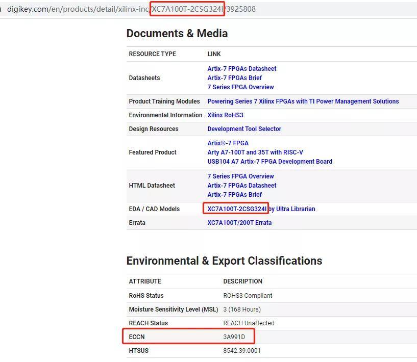型號(hào):XC7A100T-2CSG324I,品牌:賽靈思(Xilinx)的ECCN是“3A991D”,表示“可以出口到中國(guó)”。
